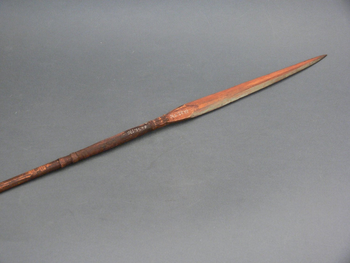 Kétrészes nyílvessző. A bambuszból metszett szárba ragasztóanyaggal megerősített növényi rostfonattal rögzítették az ugyancsak bambuszból faragott levél alakú hegyet. A szárba hosszanti irányban futó csíkokat égettek.