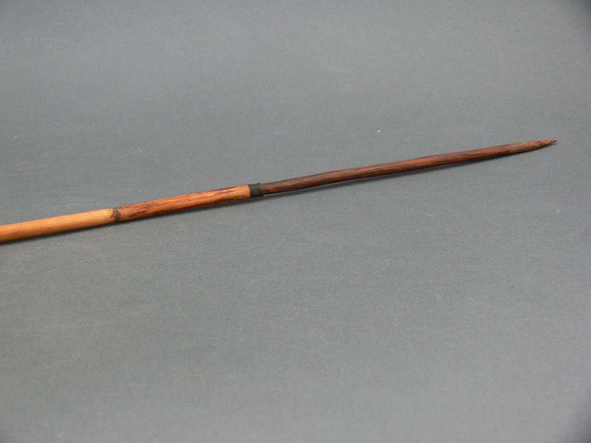 Kétrészes nyílvessző. A bambuszból metszett szárba mára elveszett növényi rostfonattal rögzíthették a fából faragott, kerek keresztmetszetű hegyet. A szárba öt helyen hosszanti irányba futó csíkokat égettek bele.
