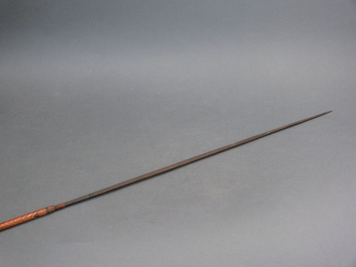Kétrészes nyílvessző. A bambuszból metszett szárba növényi rostfonattal rögzítették a fából faragott, négyzetes keresztmetszetű hegyet, melynek alsó végének közelébe kissé kiemelkedő, körbefutó díszítményt faragtak. A szárba párhuzamos vonalakból, háromszögekből és cikk-cakk elemekből álló mintát égettek.