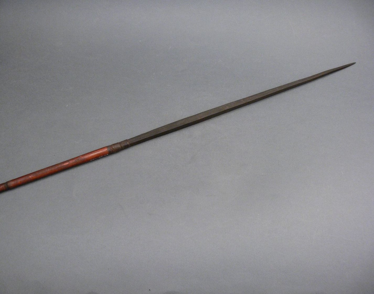 Kétrészes nyílvessző. A bambuszból metszett szárba növényi rostfonattal rögzítették a fából faragott, négyzetes keresztmetszetű hegyet.