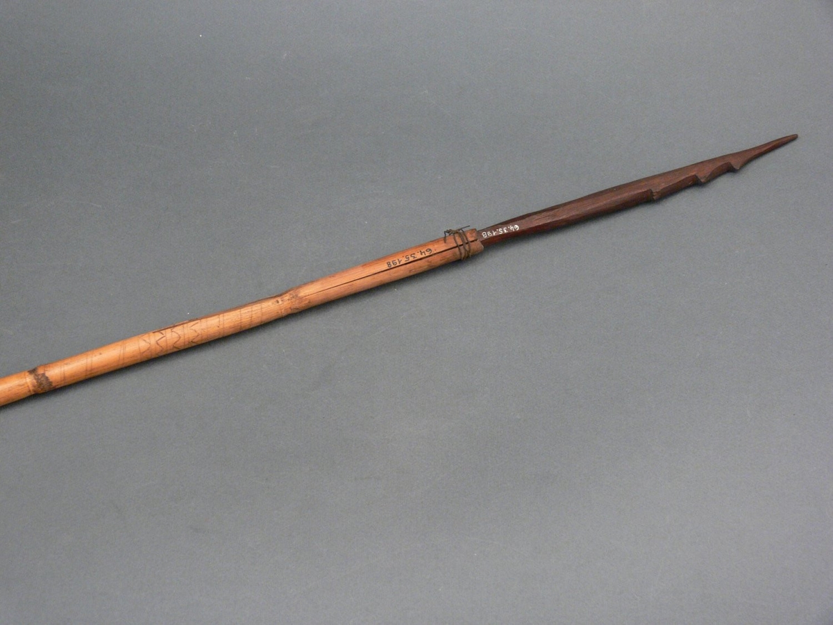 Kétrészes nyílvessző. A bambuszból metszett szárba mára elveszett növényi rostzsineggel rögzíthették a fából faragott, ovális keresztmetszetű, elülső végénél három szakával ellátott hegyet. Szárába rézsútos és cikk-cakk vonalakból álló mintát karcoltak.
