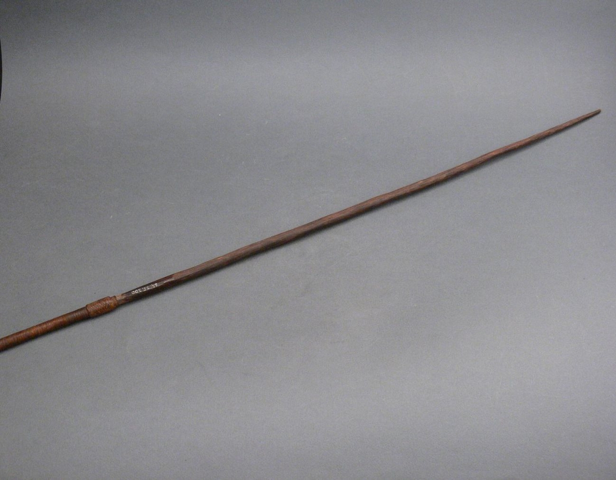 Kétrészes nyílvessző. A bambuszból metszett szárba növényi rostfonattal rögzítették a fából faragott, kerek keresztmetszetű hegyet.