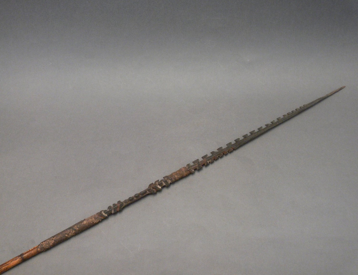 Kétrészes nyílvessző. A bambuszból metszett szárba növényi rostfonattal rögzítették a fából faragott, barnára festett, négyzetes keresztmetszetű hegyet, melynek éleibe szakákat faragtak.
