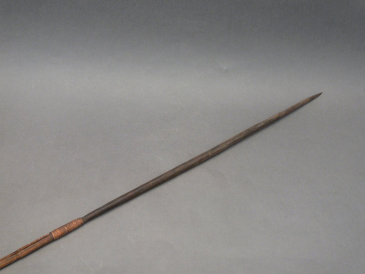 Kétrészes nyílvessző. A bambuszból metszett szárba növényi rosttal rögzítették a fából faragott, kerek keresztmetszetű, sötétbarnára festett hegyet.