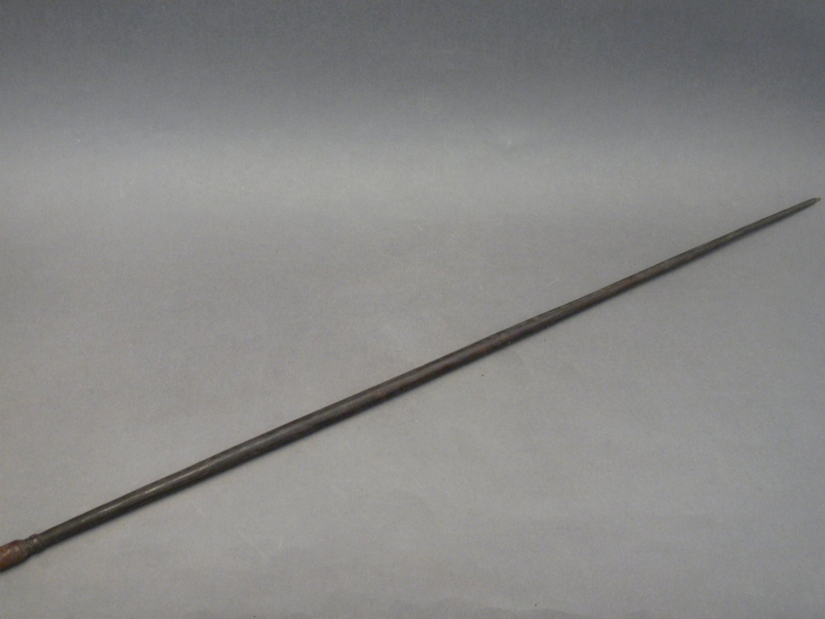 Kétrészes nyílvessző. A bambuszból metszett szárba növényi rostfonattal rögzítették a fából faragott, kerek keresztmetszetű, sötétbarnára festett hegyet.