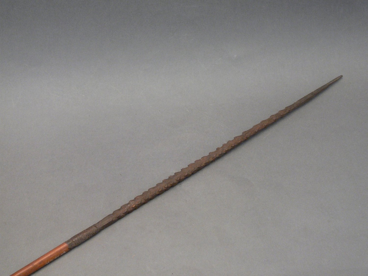 Kétrészes nyílvessző. A bambuszból metszett szárba növényi rostfonattal rögzítették a fából faragott, barnára festett, négyzetes keresztmetszetű hegyet, melynek valamennyi élébe szakákat faragtak.