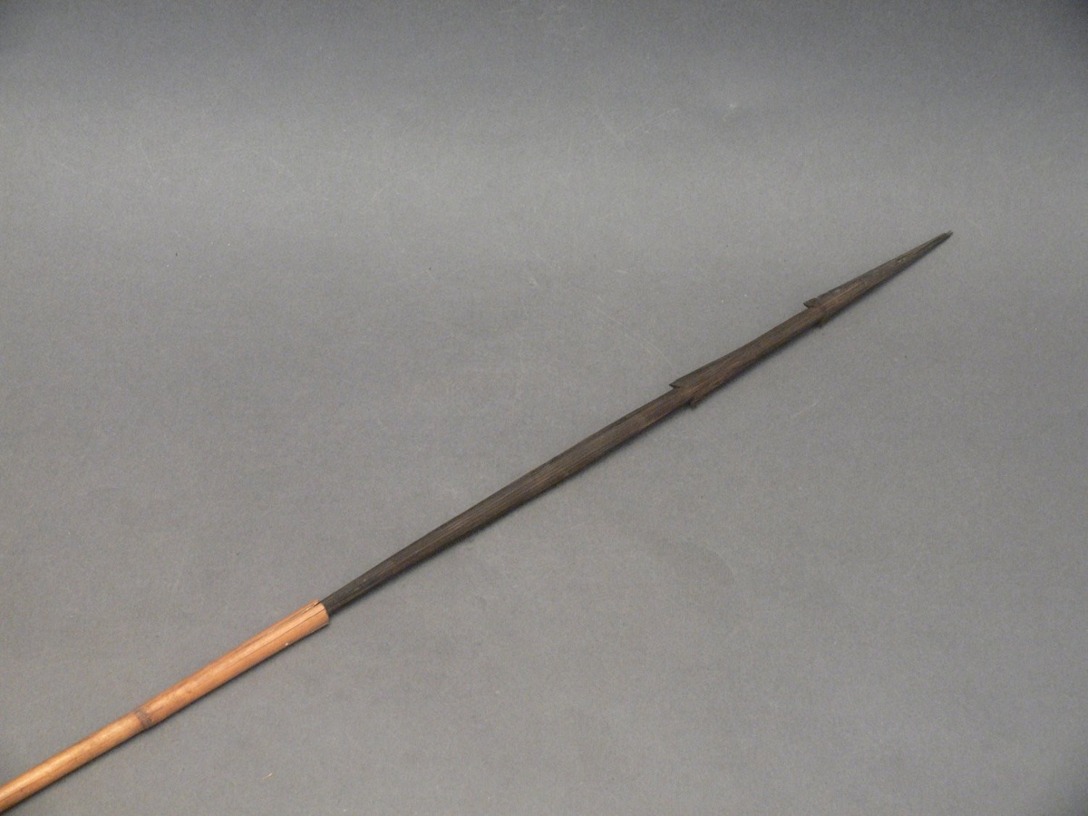 Kétrészes nyílvessző. A bambuszból metszett szárba növényi rostfonattal rögzítették a fából faragott, barnára festett, hegyet, melynek éleibe szakákat faragtak.