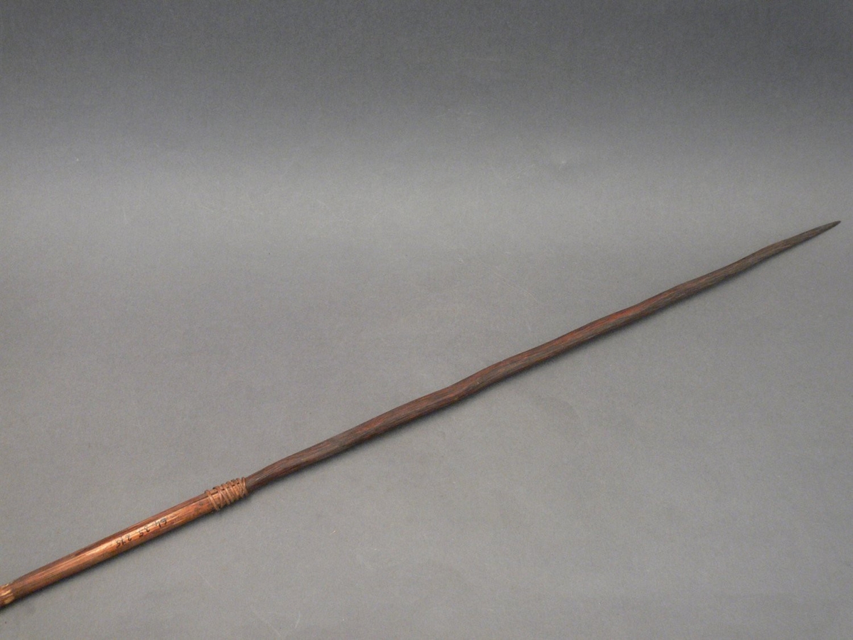 Kétrészes nyílvessző. A bambuszból metszett szárba növényi rosttal rögzítették a fából faragott, kerek keresztmetszetű, sötétbarnára festett hegyet.
