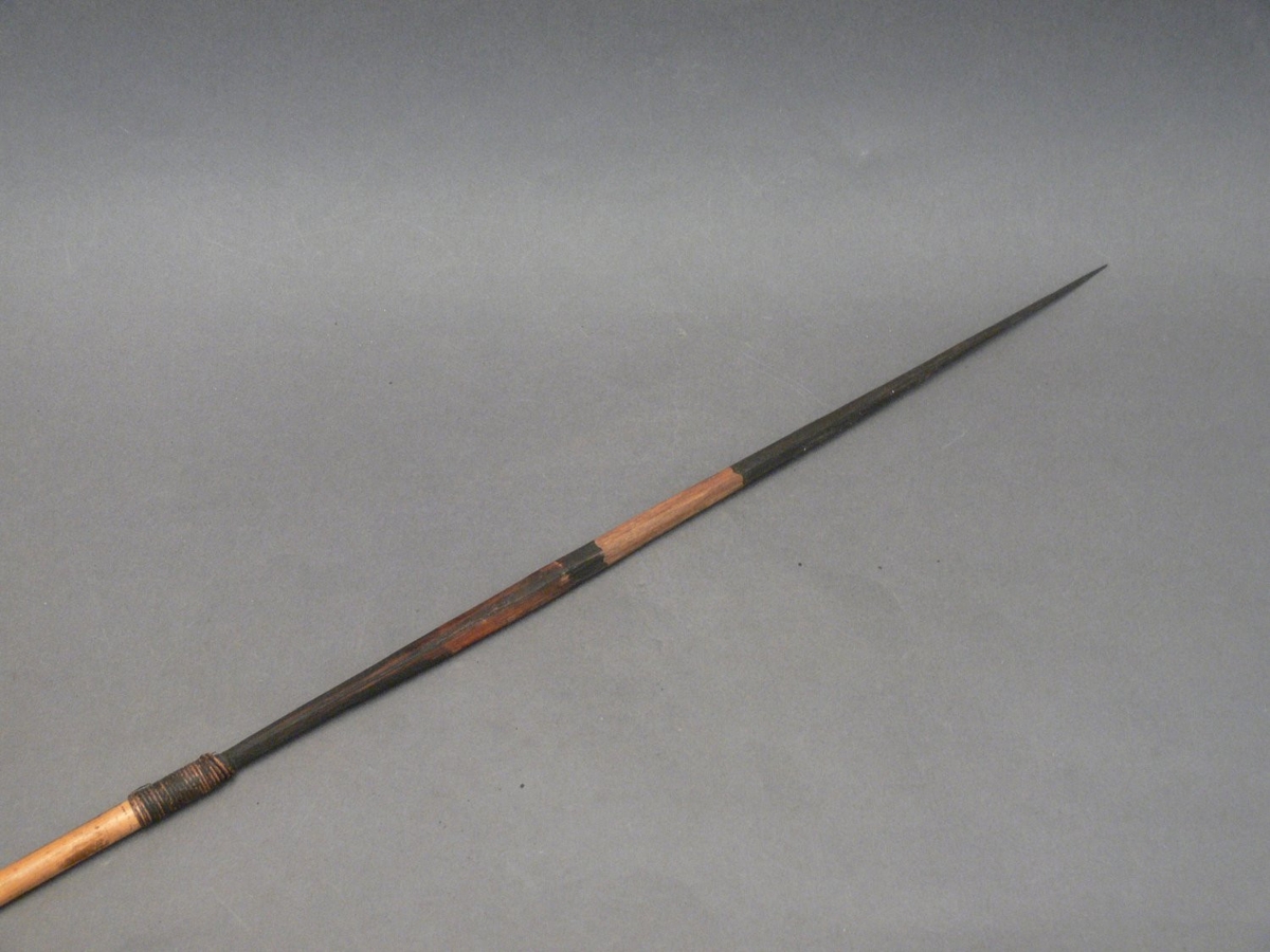 Kétrészes nyílvessző. A bambuszból metszett szárba növényi rosttal rögzítették a fából faragott hegyet, melynek két végét feketére, középső részét vörösre festették.