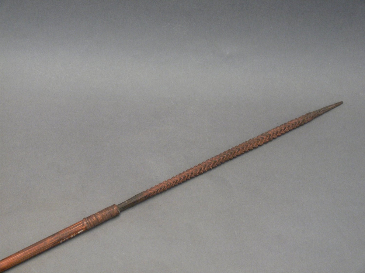 Kétrészes nyílvessző. A bambuszból metszett szárba növényi rosttal rögzítették a fából faragott, vörösesbarnára festett, négyzetes keresztmetszetű hegyet, melynek valamennyi élébe szakákat faragtak.