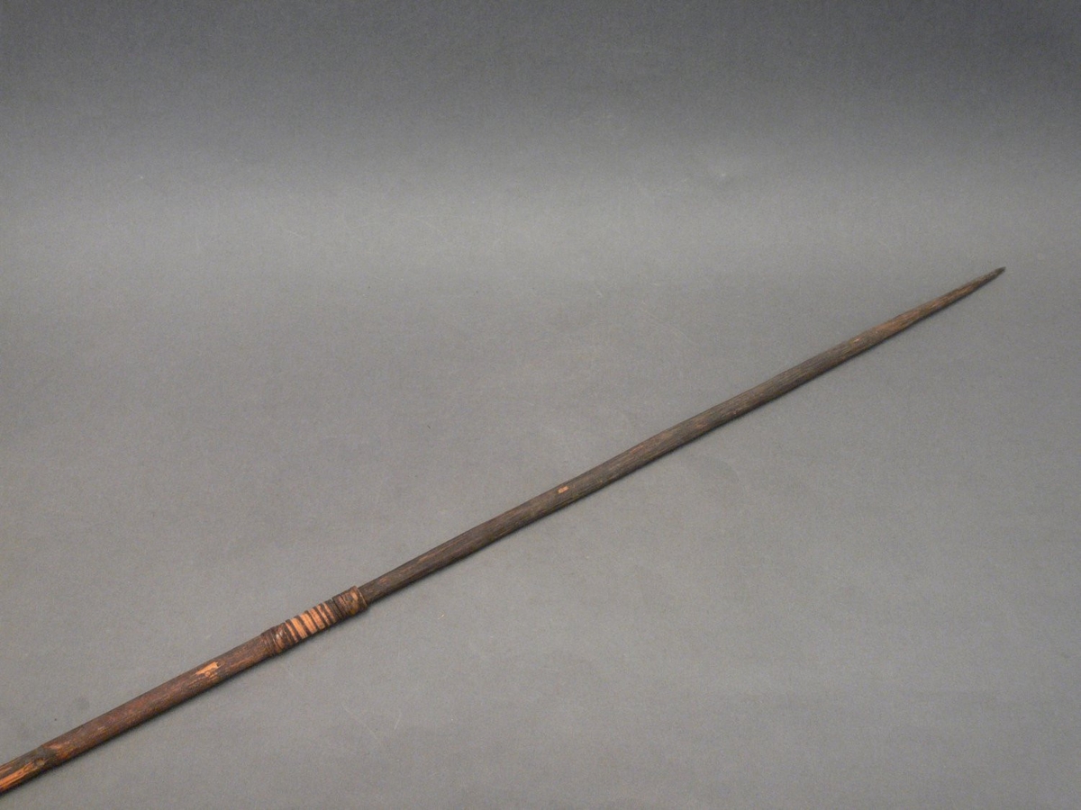 Kétrészes nyílvessző. A bambuszból metszett szárba növényi rosttal rögzítették a fából faragott, kerek keresztmetszetű, sötétbarnára festett hegyet.