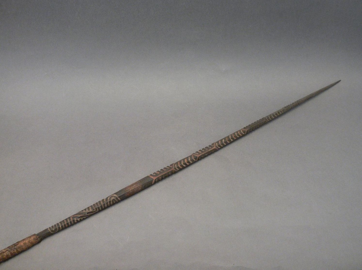 Kétrészes nyílvessző. A bambuszból metszett szárba növényi rostfonattal rögzítették a fából faragott, barnára festett, négyzetes keresztmetszetű hegyet, melybe geometrikus mintákat kiadó elemeket faragtak.