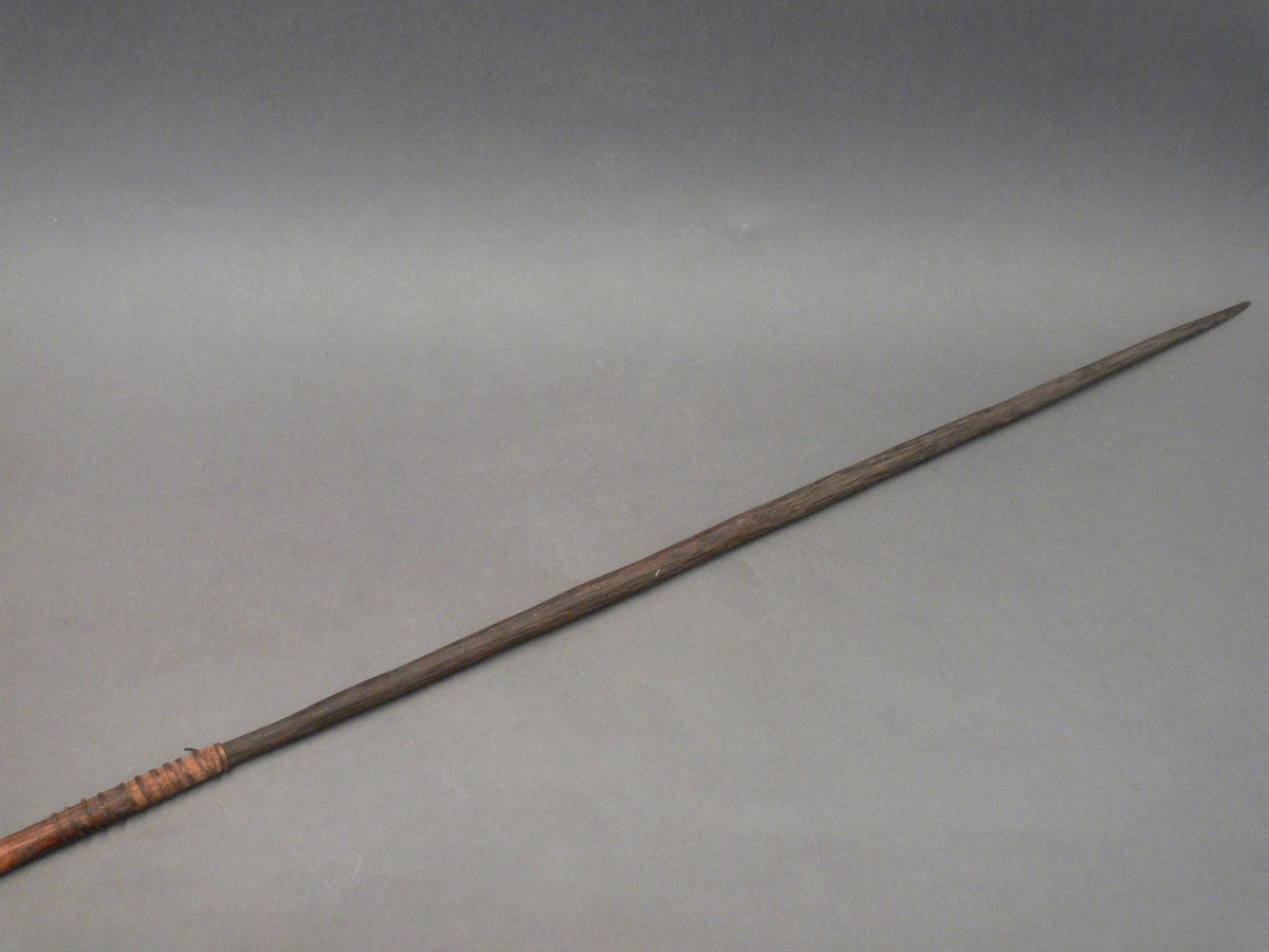 Kétrészes nyílvessző. A bambuszból metszett szárba növényi rosttal rögzítették a fából faragott, kerek keresztmetszetű, barnára festett hegyet.