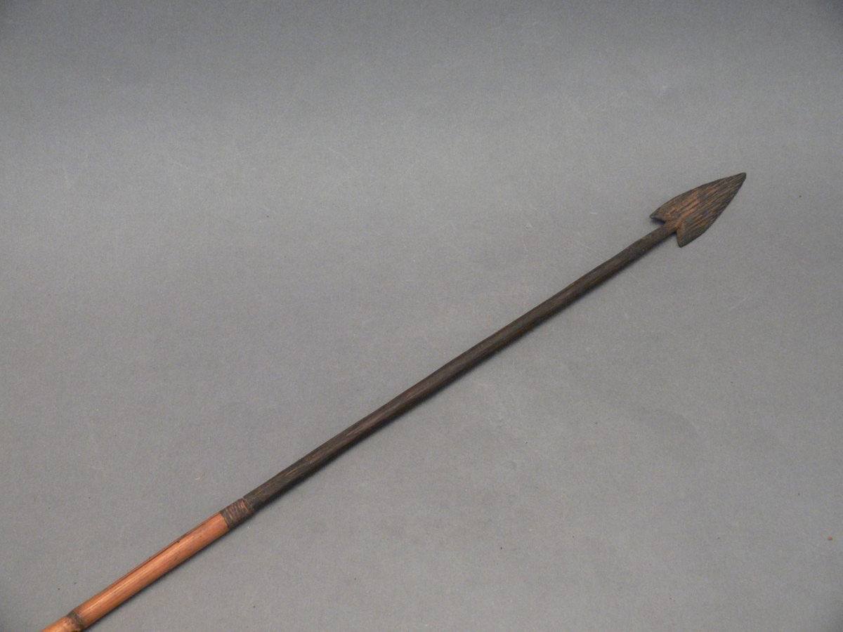 Kétrészes nyílvessző. A bambuszból metszett szárba növényi rosttal erősítették a fából faragott, barnára színezett hegyet.