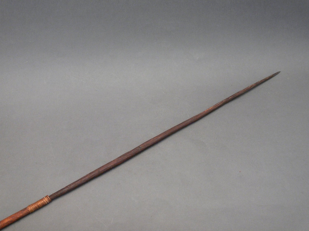 Kétrészes nyílvessző. A bambuszból metszett szárba növényi rosttal erősítették a fából faragott, barnára színezett hegyet.