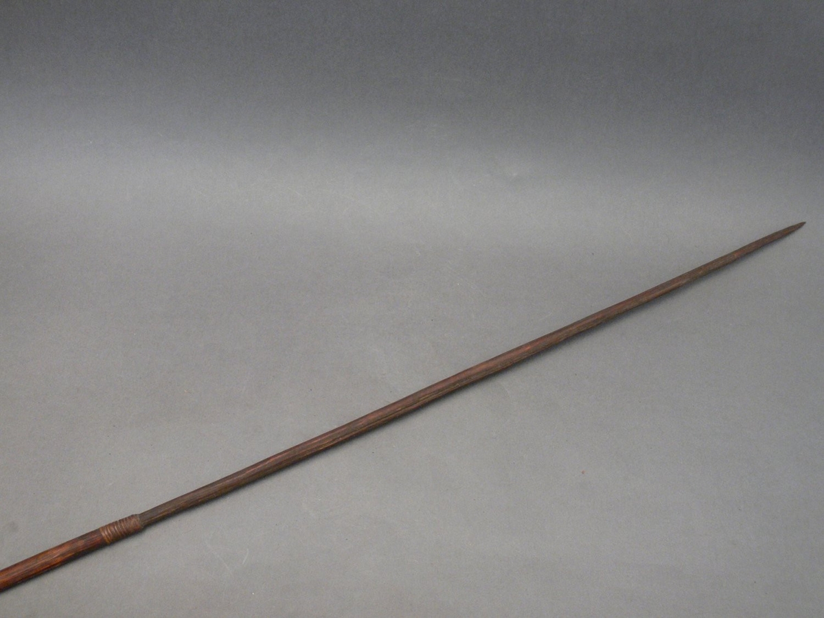 Kétrészes nyílvessző. A bambuszból metszett szárba növényi rosttal erősítették a fából faragott, kerek keresztmetszetű, barnára színezett hegyet.