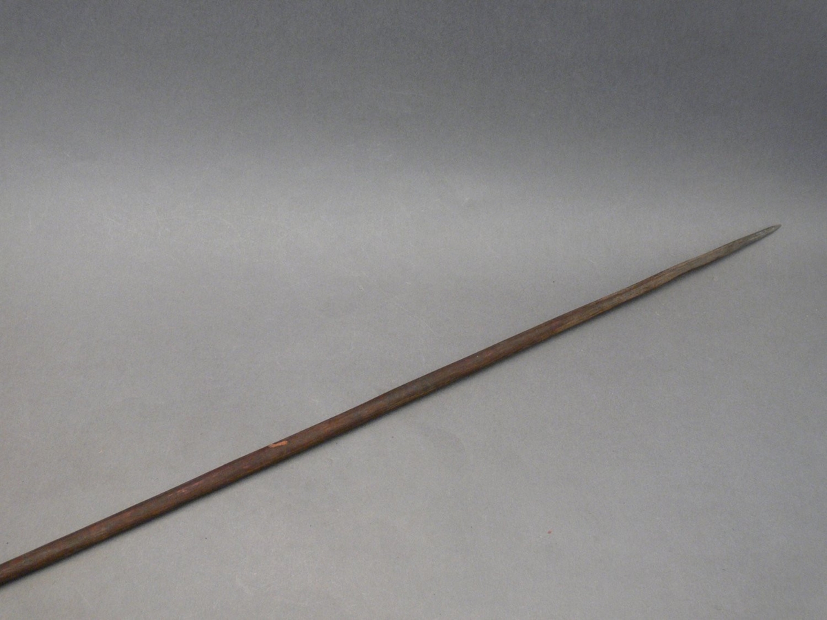 Kétrészes nyílvessző. A bambuszból metszett szárba növényi rosttal erősítették a fából faragott, kerek keresztmetszetű, barnára színezett hegyet.