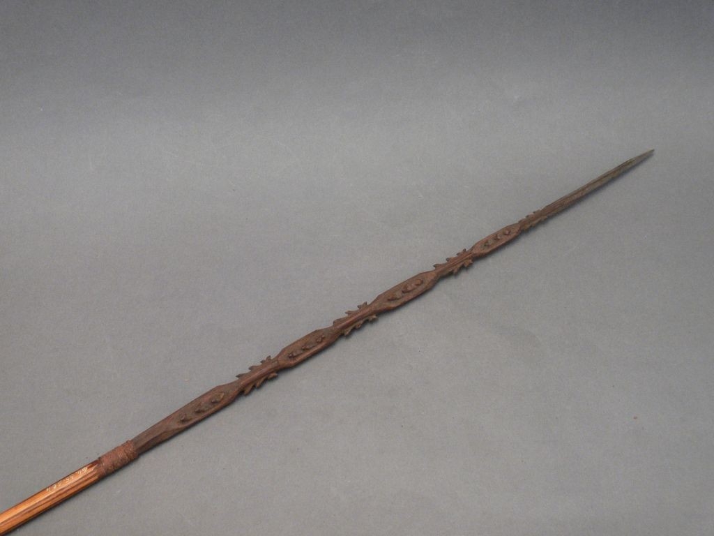 Kétrészes nyílvessző. A bambuszból metszett szárba növényi rosttal erősítették a fából faragott, barnára színezett, faragott díszekkel ellátott hegyet.