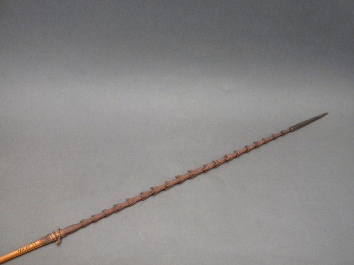 Kétrészes nyílvessző. A bambuszból metszett szárba növényi rosttal erősítették a fából faragott, vöröses barnára színezett, faragott szakákkal ellátott hegyet.