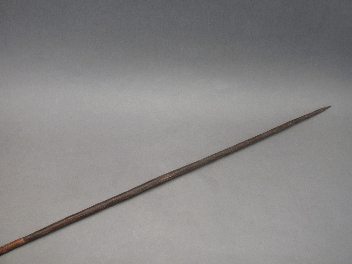 Kétrészes nyílvessző. A bambuszból hasított szárba növényi rosttal fából faragott, kerek keresztmetszetű, barnára színezett hegyet rögzítettek.