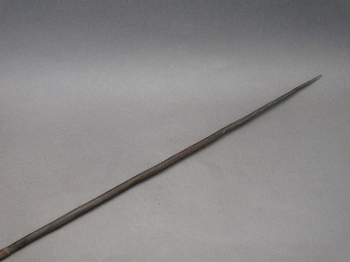 Kétrészes nyílvessző. A bambuszból hasított szárba növényi rosttal fából faragott, kerek keresztmetszetű, barnára színezett hegyet rögzítettek.
