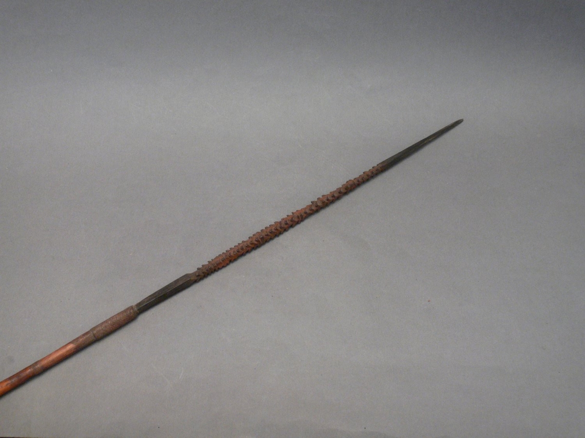 Kétrészes nyílvessző. A bambuszból metszett szárba növényi rosttal erősítették a fából faragott, vöröses barnára színezett, faragott díszekkel ellátott hegyet.