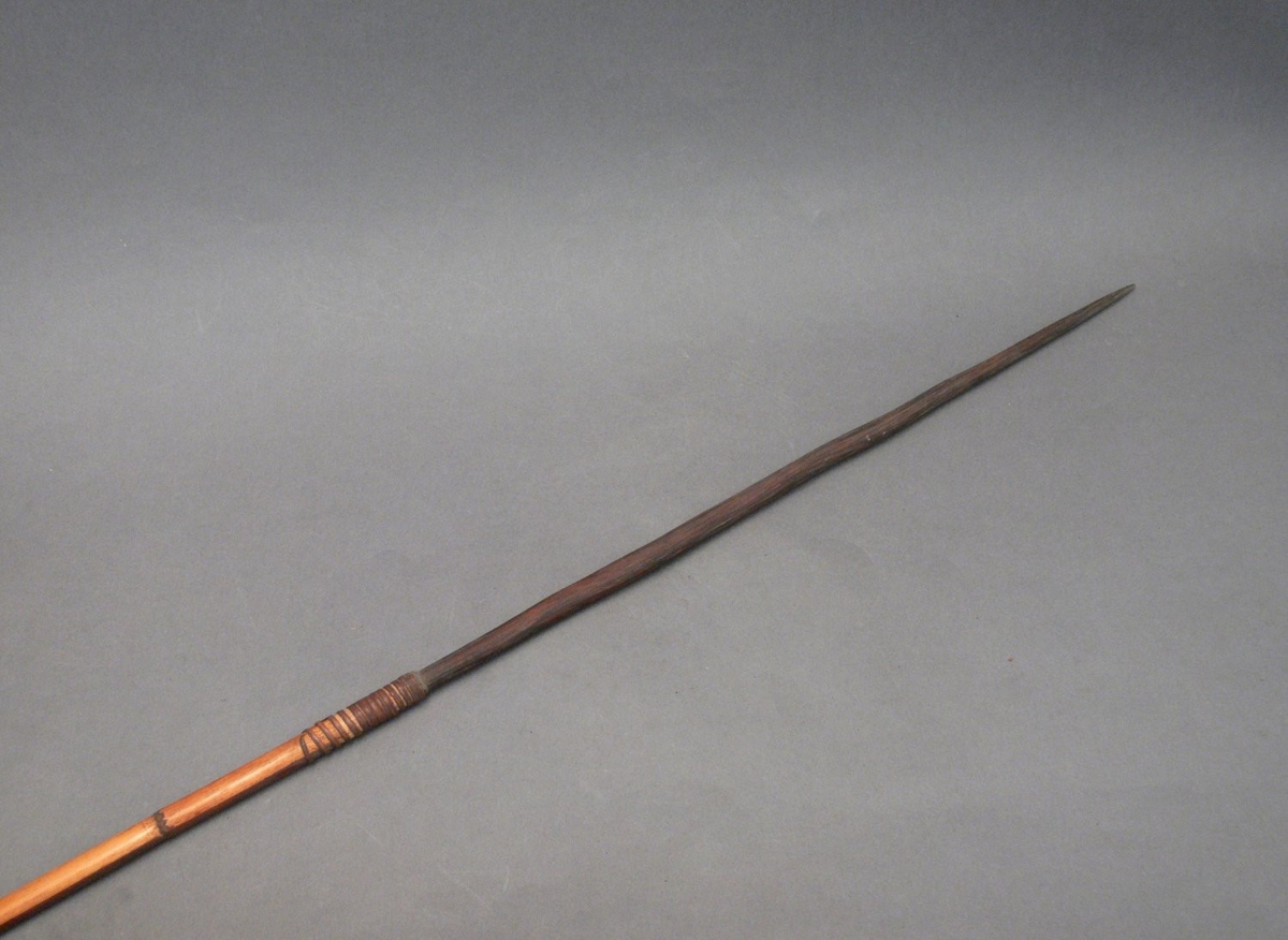 Kétrészes nyílvessző. A bambuszból metszett szárba növényi rosttal erősítették a fából faragott, ovális keresztmetszetű, barnára színezett hegyet.