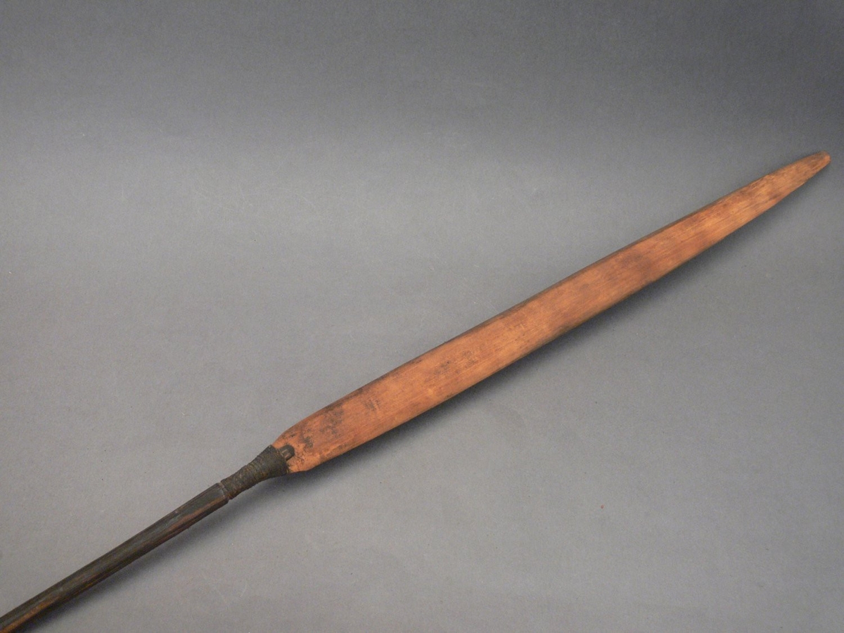 Háromrészes nyílvessző. A bambuszból metszett szárba növényi rostfonattal rögzítették a fából faragott középső részt, amihez hasonló technikával rögzítették a levél alakú bambuszhegyet.