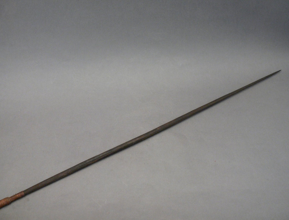 Kétrészes nyílvessző. A bambuszból hasított szárba növényi rostfonattal fából faragott, kerek keresztmetszetű, barnára színezett hegyet rögzítettek.