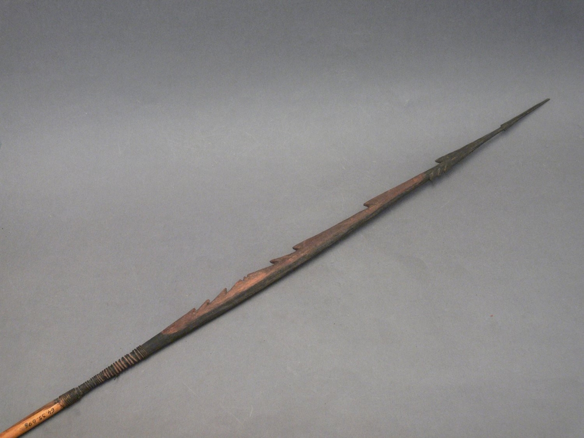 Kétrészes nyílvessző. A bambuszból metszett szárba növényi rosttal erősítették a fából faragott, barnára színezett, szakákkal ellátott hegyet.