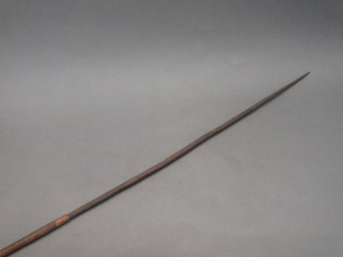 Kétrészes nyílvessző. A bambuszból metszett szárba növényi rosttal erősítették a fából faragott, ovális keresztmetszetű, barnára színezett hegyet.