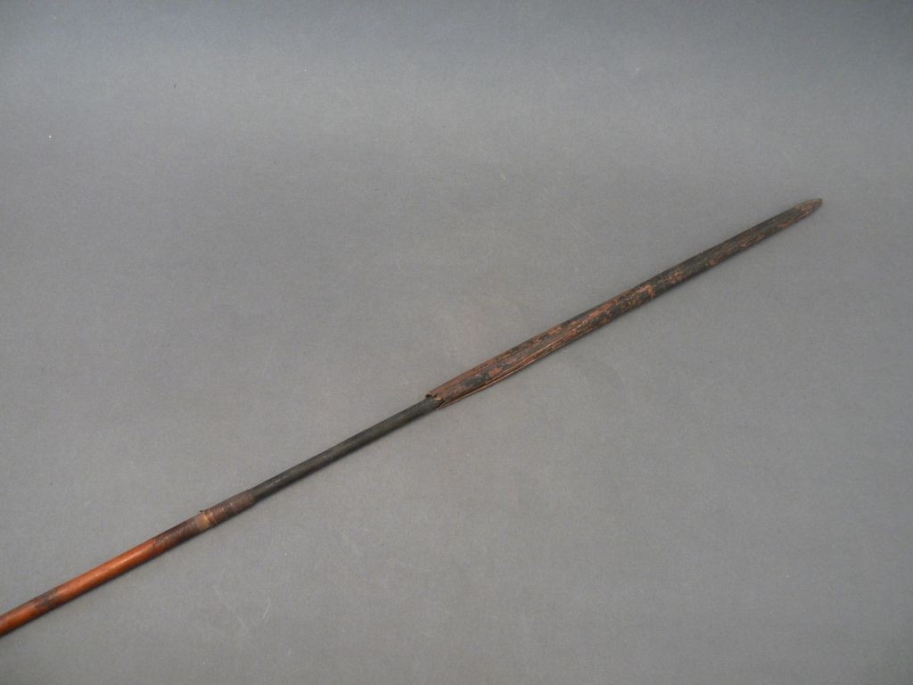 Kétrészes nyílvessző. A bambuszból metszett szárba növényi rosttal rögzítették a fából faragott kerek keresztmetszetű hegyet, melybe vörös és fehér festékkel kitöltött geometrikus motívumokat faragtak.