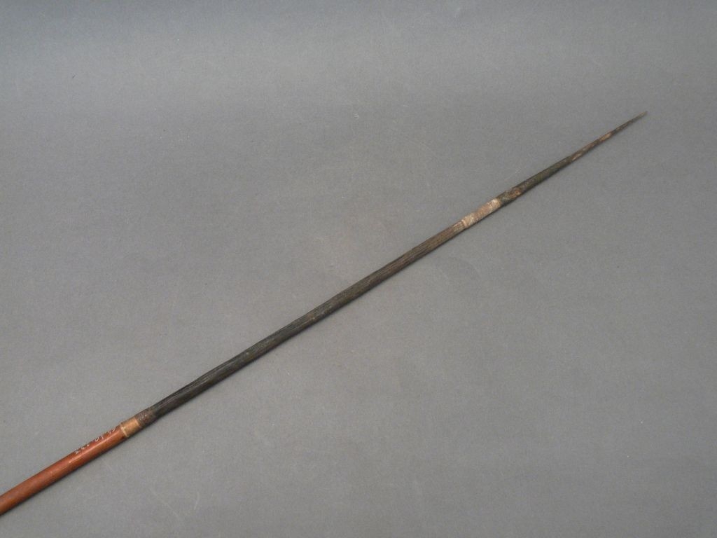 Kétrészes nyílvessző. A bambuszból metszett szárba növényi rosttal rögzítették a fából faragott, kerek keresztmetszetű hegyet.