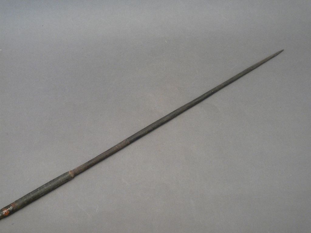 Kétrészes nyílvessző. A nádból metszett szárba lapos zsineggel rögzítették hozzá a fából faragott, kerek keresztmetszetű hegyet.
