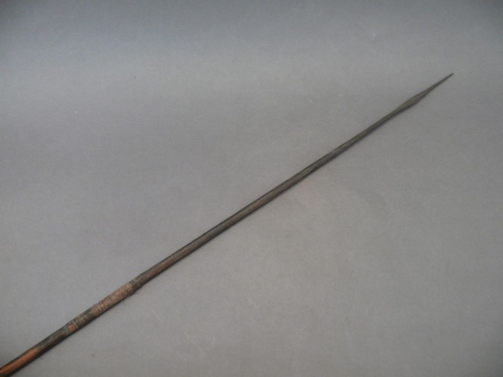 Kétrészes nyílvessző. A nádból metszett szárba lapos zsineggel rögzítették hozzá a fából faragott, kerek keresztmetszetű hegyet.