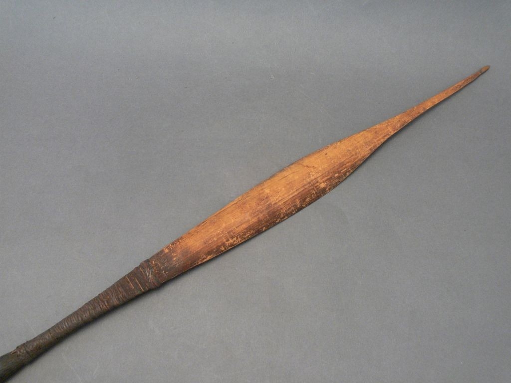 Háromrészes nyílvessző. A nádból metszett szárba növényi rostzsineggel rögzítették a keményfából faragott, hengeres keresztmetszetű középrészt, ahhoz pedig hasonló technikával az ugyancsak bambuszból hasított levélalakú hegyet.