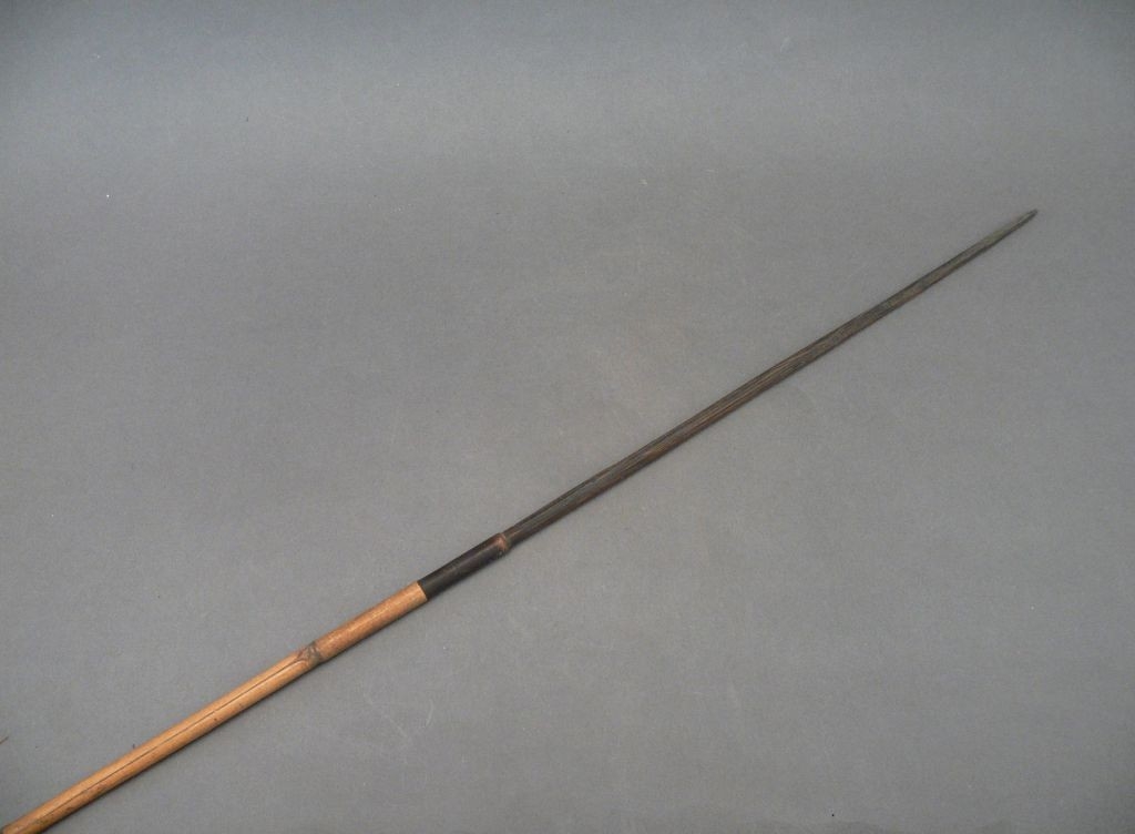 Kétrészes nyílvessző. A nádból metszett szárba illesztették a fából faragott, kerek keresztmetszetű hegyet, melybe kilenc sávban körbefutó párhuzamos vonalakat égettek.