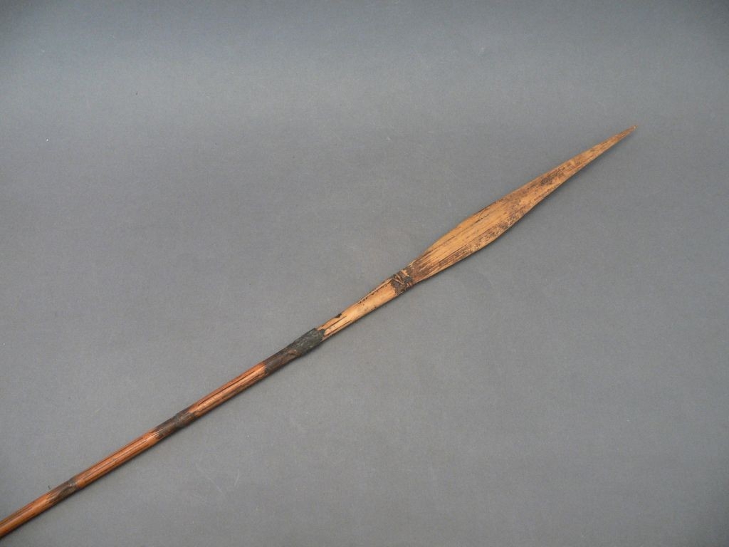 Kétrészes nyílvessző. A bambuszból metszett szárba növényi rosttal rögzítették a fából faragott, kétágú hegyet, melyek egyikébe szakákat faragtak.