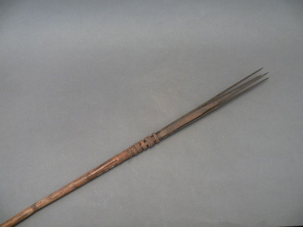 Négyágú halászónyíl. A bambuszból metszett szárba növényi rostfonattal rögzítették a fából faragott, széttartóan elrendezett hegyeket.