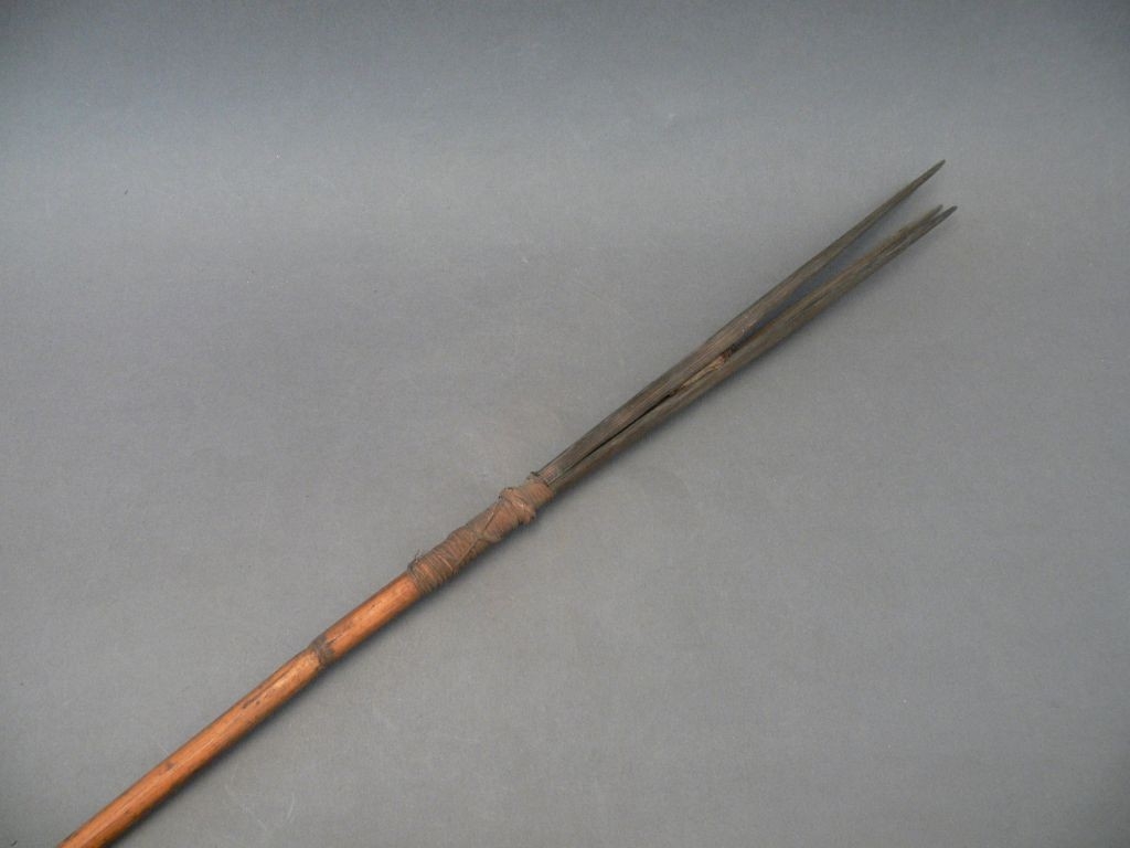 Négyágú halászónyíl. A bambuszból metszett szárba növényi rostfonattal rögzítették a fából faragott, széttartóan elrendezett hegyeket.