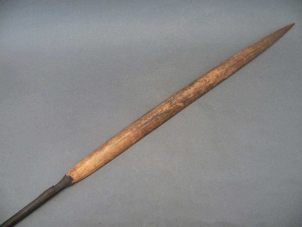 Háromrészes nyílvessző. A nádból metszett szárba növényi rosttal rögzítették a keményfából faragott, hengeres keresztmetszetű középrészt, ahhoz pedig hasonló technikával az ugyancsak bambuszból hasított levélalakú hegyet, melynek belső oldalára fekete csíkot festettek.