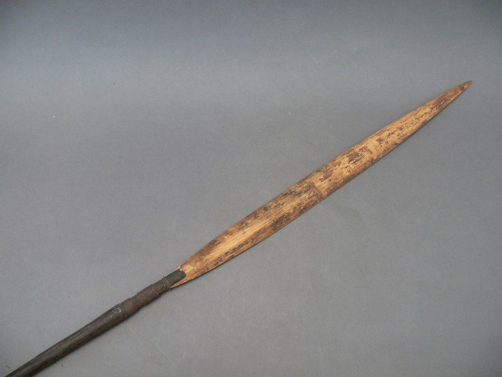 Háromrészes nyílvessző. A bambuszból metszett szárba növényi rosttal rögzítették a fából faragott kerek keresztmetszetű középrészt, ahhoz pedig hasonló technikával a levél alakú bambuszhegyet.