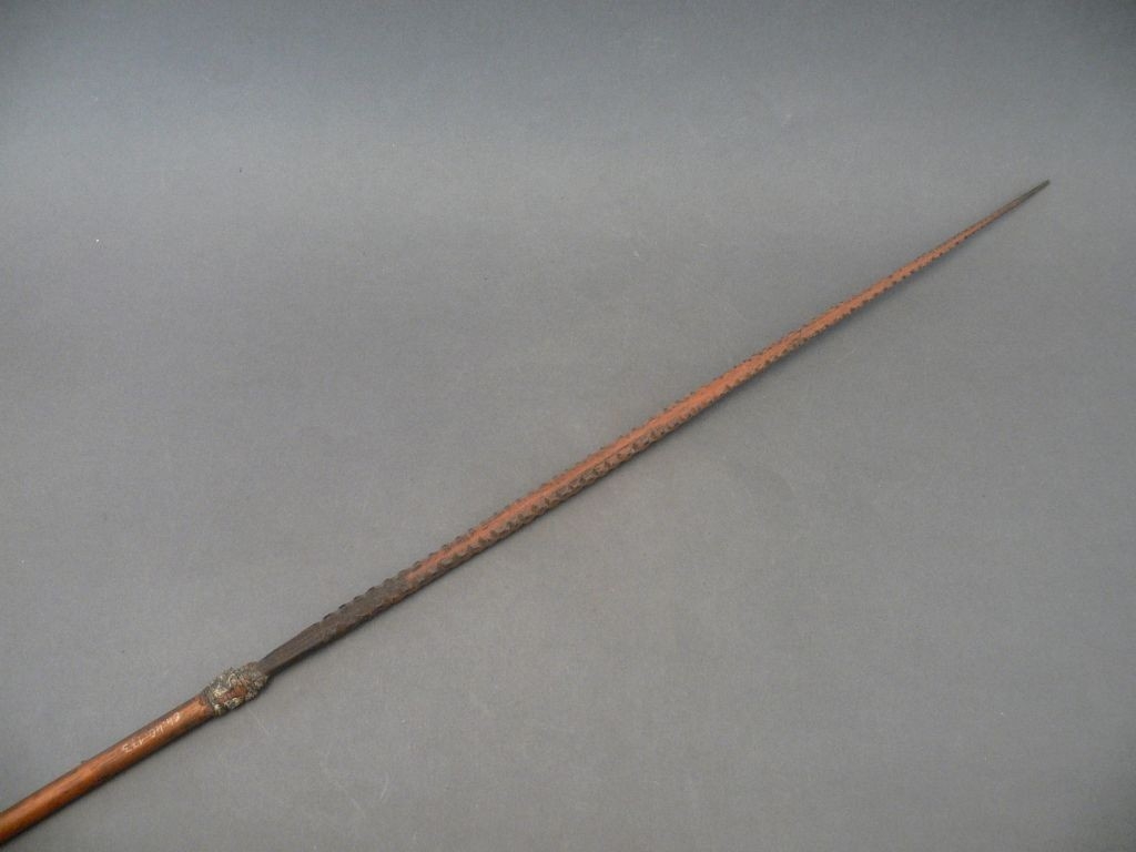 Kétrészes nyílvessző. A nádból metszett szárba növényi rosttal rögzítették a keményfából faragott, élein szakákkal ellátott, hegyet.