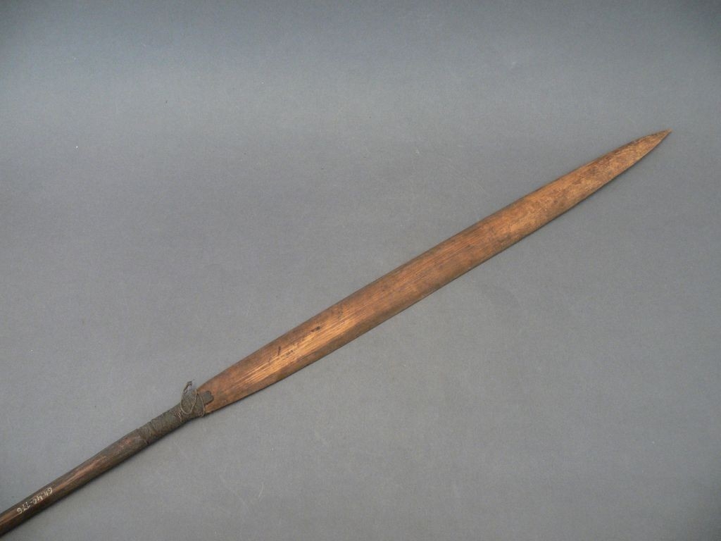 Kétrészes nyílvessző. A nádból metszett szárba növényi rostzsineggel rögzítették az ugyancsak bambuszból hasított levélalakú hegyet, melynek belső oldalára fekete csíkot festettek.