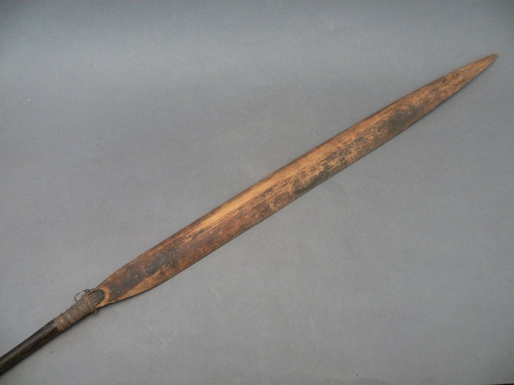 Háromrészes nyílvessző. A nádból metszett szárba növényi rosttal rögzítették a keményfából faragott, hengeres keresztmetszetű középrészt, ahhoz pedig hasonló technikával az ugyancsak bambuszból hasított levélalakú hegyet, melynek belső oldalára fekete csíkot festettek.