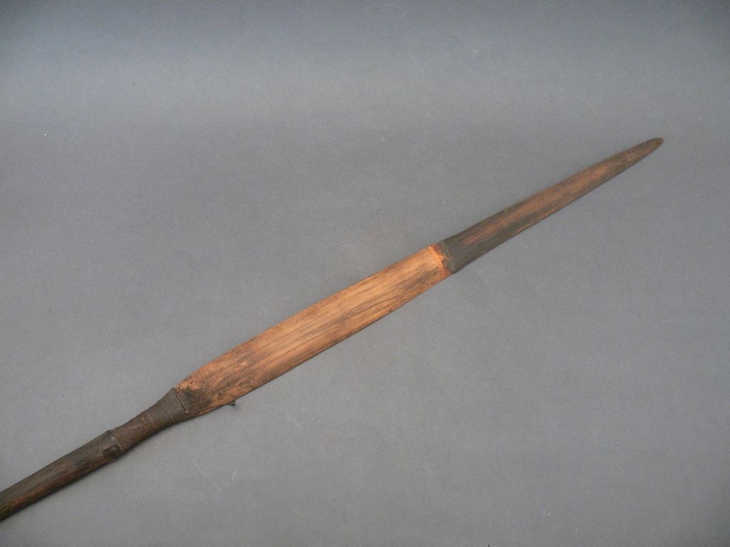 Háromrészes nyílvessző. A nádból metszett szárba növényi rosttal rögzítették a keményfából faragott, hengeres keresztmetszetű középrészt, ahhoz pedig hasonló technikával az ugyancsak bambuszból hasított levélalakú hegyet.