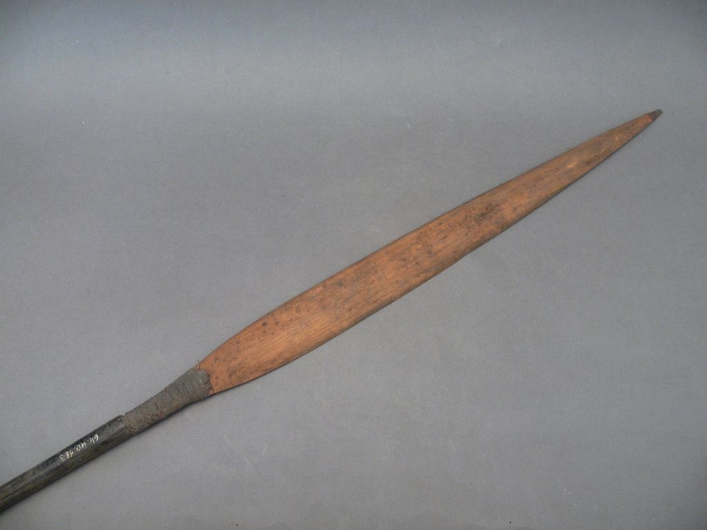 Háromrészes nyílvessző. A nádból metszett szárba növényi rosttal rögzítették a keményfából faragott, hengeres keresztmetszetű középrészt, ahhoz pedig hasonló technikával az ugyancsak bambuszból hasított levélalakú hegyet, melynek belső oldalára fekete csíkot festettek.