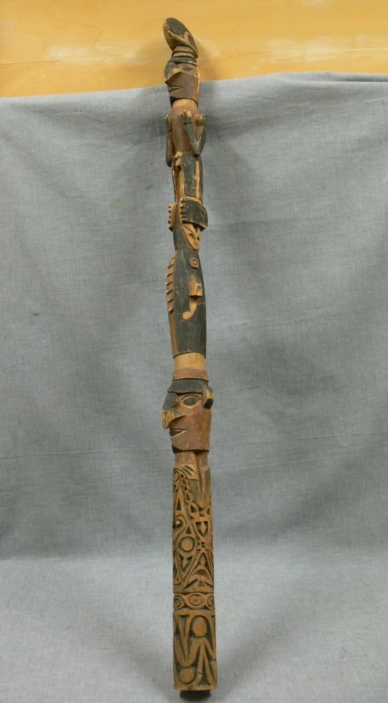 Puhafából faragott bot, melyen legfelül egy meztelen, álló férfi található, aki lábai között halat tart. Alatta egy emberi fej, legalul pedig síkdombormű-szerűen kifaragott geometrikus motívumok, illetve egymás kezét fogó emberalakok láthatók.