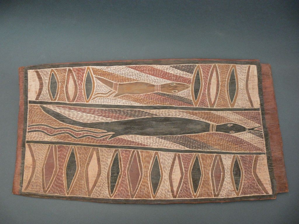 'A megtisztított, négyszögletűre vágott eukaliptuszkéregre fehér, fekete és agyagszínű mintákat festettek. A festmény hosszában háromfelé van osztva egy-egy függőleges csikkal. A középső sávban egy megnyújtott testű fekete goanna gyík látható. A baloldali sávban egy harmad akkora agyagszínű gyik van, alatta és fölötte vízszintes lencse alakú, váltakozó fehér és fekete minták agyagszínű keretben. A jobb oldalon ugyanilyen alakú, vörös, fekete, fehér minták váltakoznak. A minták közötti tér fehér, vörös, agyagszínű keresztező vonalkázással van kitöltve. Az eukaliptuszfák (Eucalyptus tetradonta) kérge könnyen lehántható a monszun év- szakban, mikor a fanedvek fölfelé kezdenek áramlani. A kéregdarabokat tüz fölött füstölik, majd a durva külső kérget eltávolítják, és a belső felületet egészen simára dörzsölik, hogy alkalmas legyen a festésre. A kéregdarabokat azután nehezékekkel nyomják le teljesen laposra.