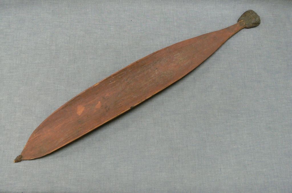 Keményfából faragott, felhajló szélű, levél alakú, egyik vége kampóban végződik, másik keskeny szárban folytatódik, végén gyanta. Vöröses földfestékkel festett.